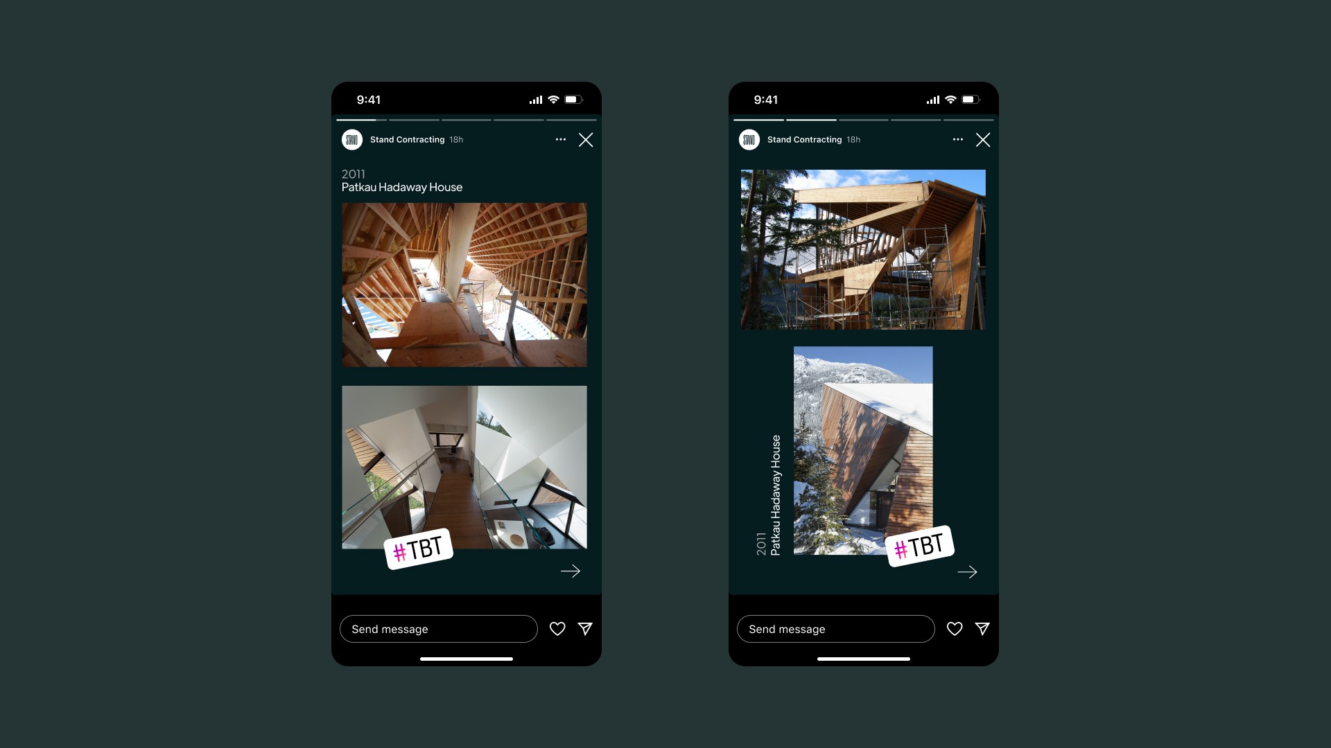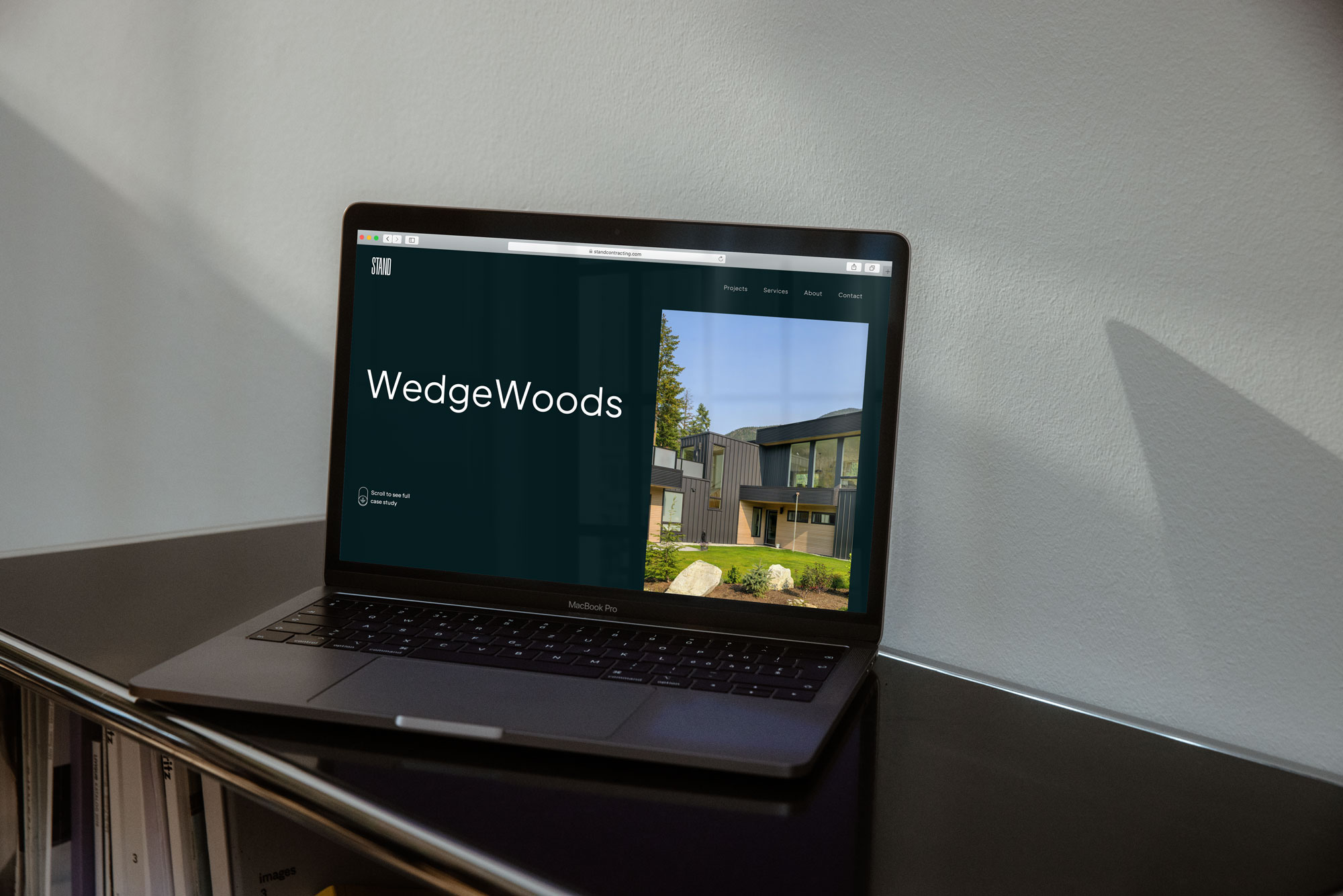 Branding and web presence for a custom home builder meant to attract top architects and potential clients. The tall, narrow custom typeface used in the logo emulates a cluster of trees, intentionally contrasting with the smaller x-height of the body font used throughout the marketing materials. Stand = a stand of trees, stand tall, stand for something.